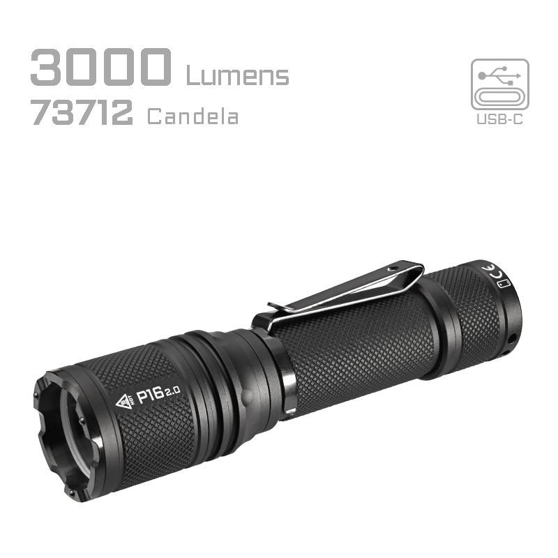 The P16 2.0 is a dual tail switch tactical flashlight with three modes. Driven by a Lumimus SFT-42R LED, it delivers a powerful 3,000-lumen beam that reaches up to 543 meters. Its custom TIR optic and anti-reflective glass lens ensure a smooth, far-reaching light. It features three modes: Tactical for high-stress scenarios, Daily for general use, and Special for simplified operation. The dual tail-switch design separates functions, allowing for precise control without fumbling. Built for durability from AL6061-T6 aluminum, it boasts an IP68 rating for water and dust resistance and can survive 1.5-meter drops. A strike bezel with zirconium beads adds a self-defense capability. Recharging is quick and easy via a hidden USB-C port, and it includes a high-drain 18650 3000mAh battery for reliable power. Compact, lightweight, and complete with a two-way clip and holster, the P16 2.0 is your ready-to-deploy tool for any task or challenge.