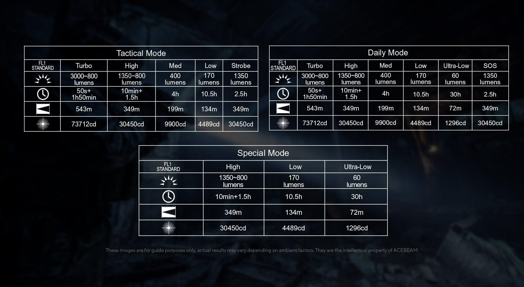 - Turbo: 3000 ~ 800 lumens; 73712cd; 543 meters; 50s +1 hour 50 minutes