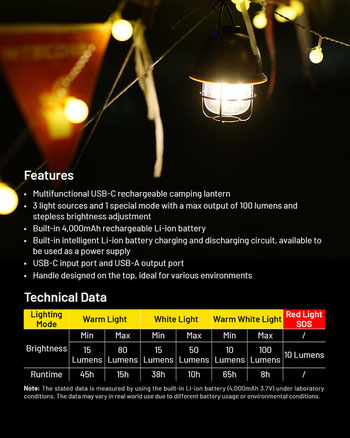 - Offers 5 brightness levels, STROBE and SOS for each color temperature