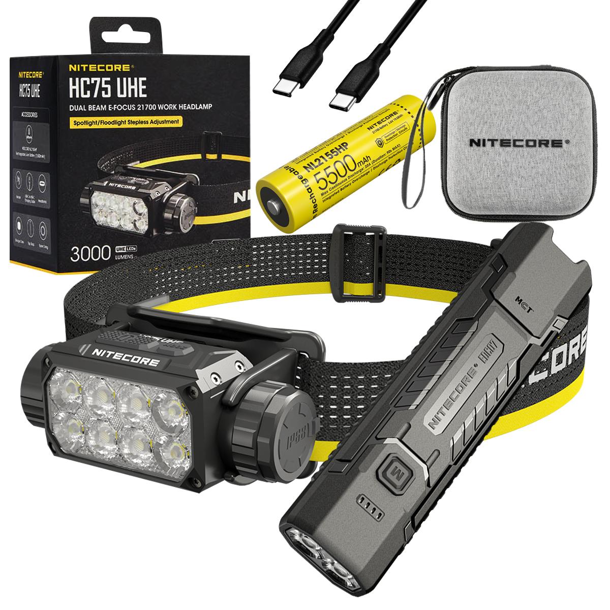 Nitecore HC75 UHE Rechargeable E-Focus Spotlight Floodlight Headlamp 192m Beam -3000 Lumens (Upgrade of HC68) w/ EDC07 Ultraslim and Lightweight High CRI Three Color Temperatures EDC Flashlight -1500 Lumens Black Color and Eco Sensa USB-C Charging Cable