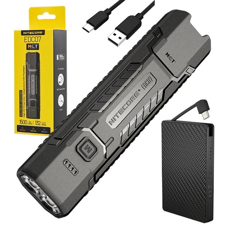 Nitecore EDC07 Ultraslim and Lightweight High CRI Three Color Temperatures EDC Flashlight -1500 Lumens Black Color w/ Pocket 10000 10,000mAh Power Charger and Eco-Sensa USB-C Charging Cable
