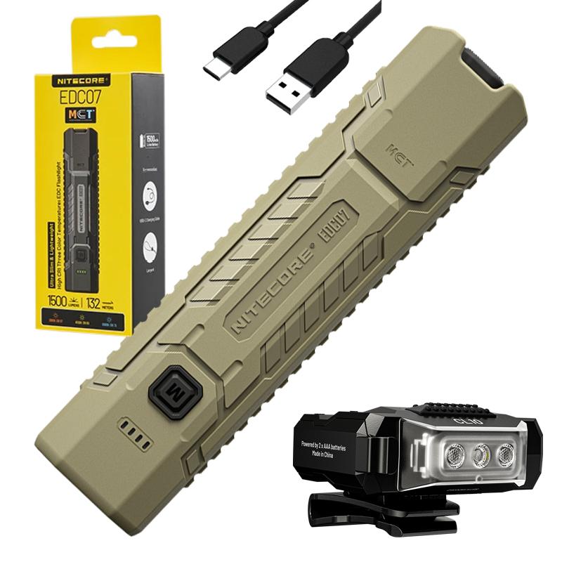 Nitecore EDC07 Ultraslim and Lightweight High CRI Three Color Temperatures EDC Flashlight -1500 Lumens Desert Tan Color w/ CL10 Multipurpose Ultra Lightweight Clip-on Light and Eco-Sensa USB-C Charging Cable
