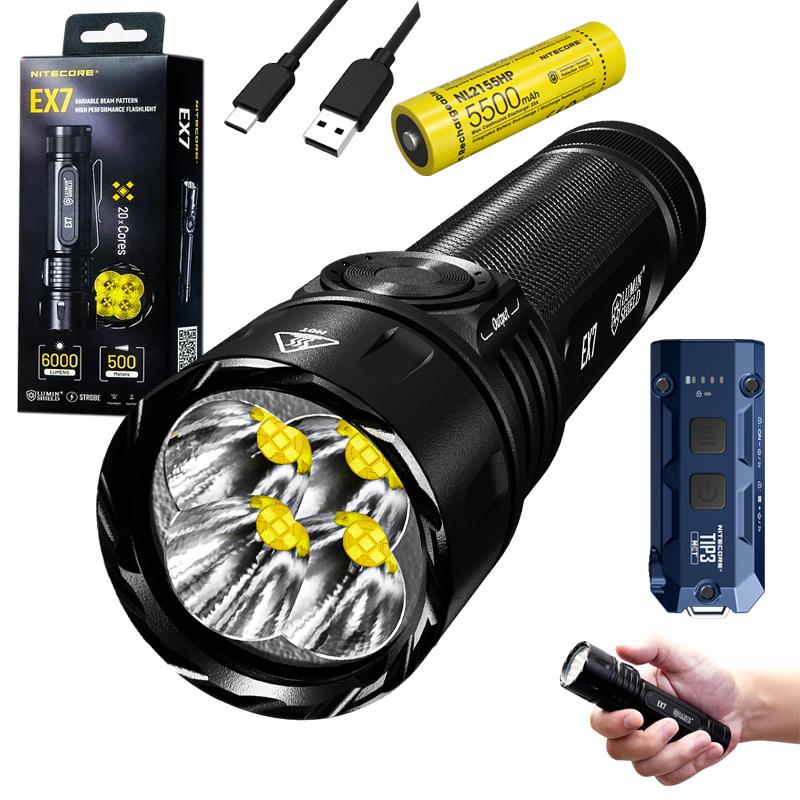 Nitecore EX7 Variable Beam Pattern High Performance LED Rechargeable Flashlight -6000 Lumens w/ TIP3 Multi Color Temperature Keychain Light - Blue