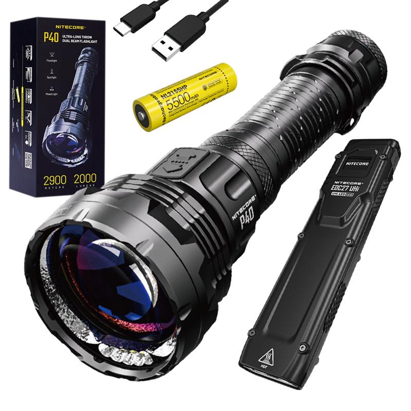 Nitecore P40 Ultra-Long Throw Dual Beam LEP Flashlight 2900 Meter -2000 Lumens w/ EDC27 UHi Ultra Slim Tactical Flashlight 3100 lumen and Eco-Sensa USB-C Charging Cable