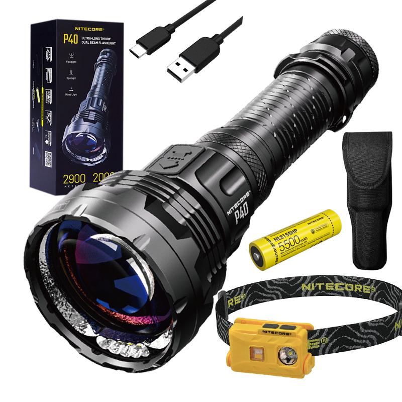 Nitecore P40 Ultra-Long Throw Dual Beam LEP Flashlight 2900 Meter -2000 Lumens w/NU25 Yellow 360 Lumen Triple Output White, Red, High CRI Rechargeable Headlamp adn Eco-Sensa Charging Cable