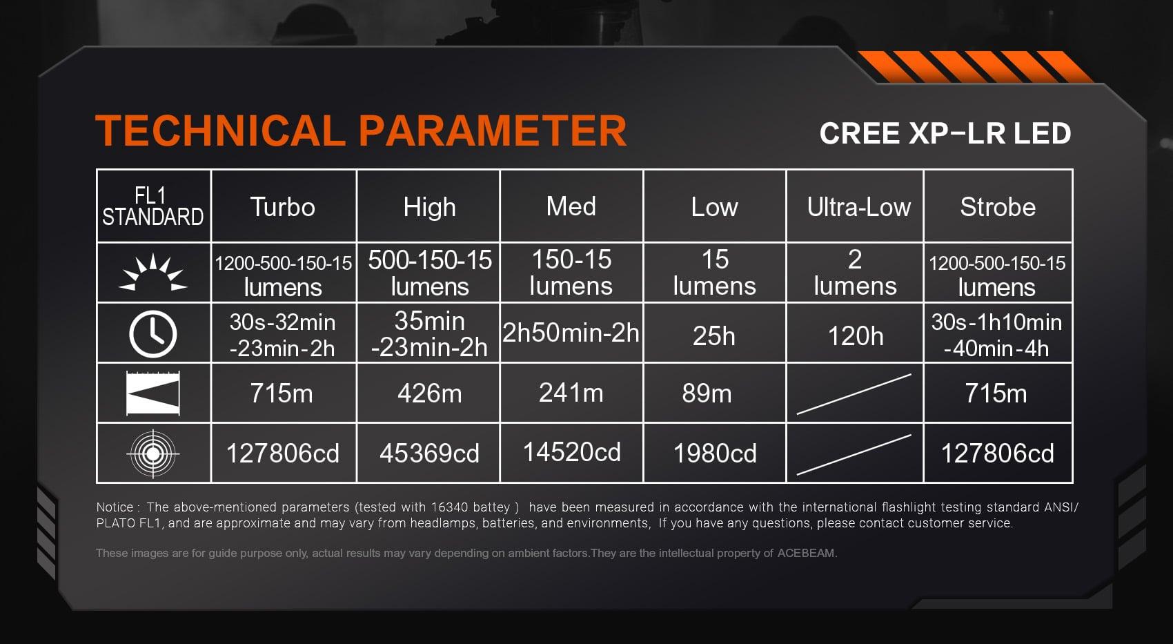 - Strobe: 1200~500~150~15 lumens; 127806cd; 715 meters; 30s+1 hours 10 minutes+40 minutes+4 hours