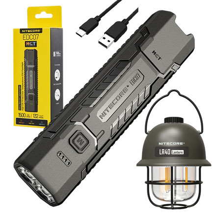 Nitecore EDC07 Black Color Ultraslim and Lightweight High CRI Three Color Temperatures EDC Flashlight -1500 Lumens w/ LR40 Green Color Camping Lantern 100 Lumen and Eco-Sensa USB-C Charging Cable