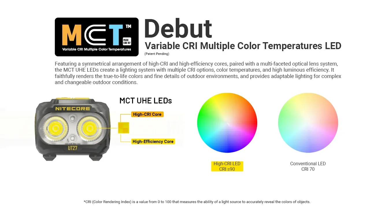 MCT (Variable CRI Multiple Color Temperatures) Lighting System. Featuring a symmetrical arrangement of high-CRI and high-efficiency cores, paired with a multi-faceted optical lens system, the MCT UHE LEDs create a lighting system with multiple CRI options, color temperatures, and high luminous efficiency. It faithfully renders the true-to-life colors and fine details of outdoor environments, and provides adaptable lighting for complex and changeable outdoor conditions.