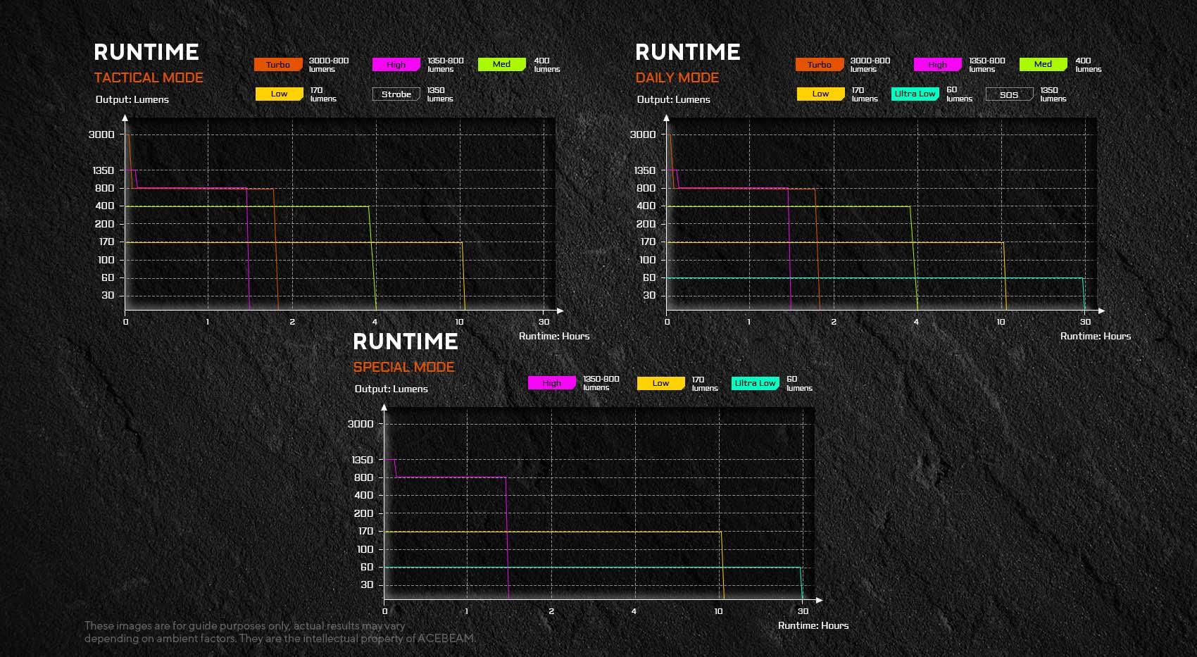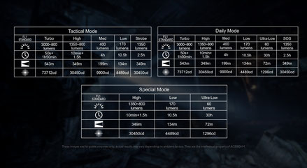 - Turbo: 3000 ~ 800 lumens; 73712cd; 543 meters; 50s +1 hour 50 minutes