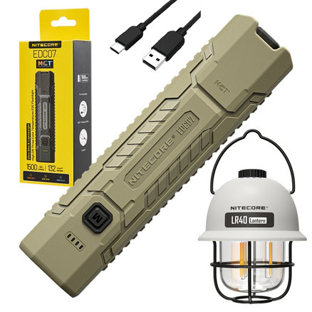 Nitecore EDC07 Desert Tan Color Ultraslim and Lightweight High CRI Three Color Temperatures EDC Flashlight -1500 Lumens w/ LR40 White Color Camping Lantern 100 Lumen and Eco-Sensa USB-C Charging Cable