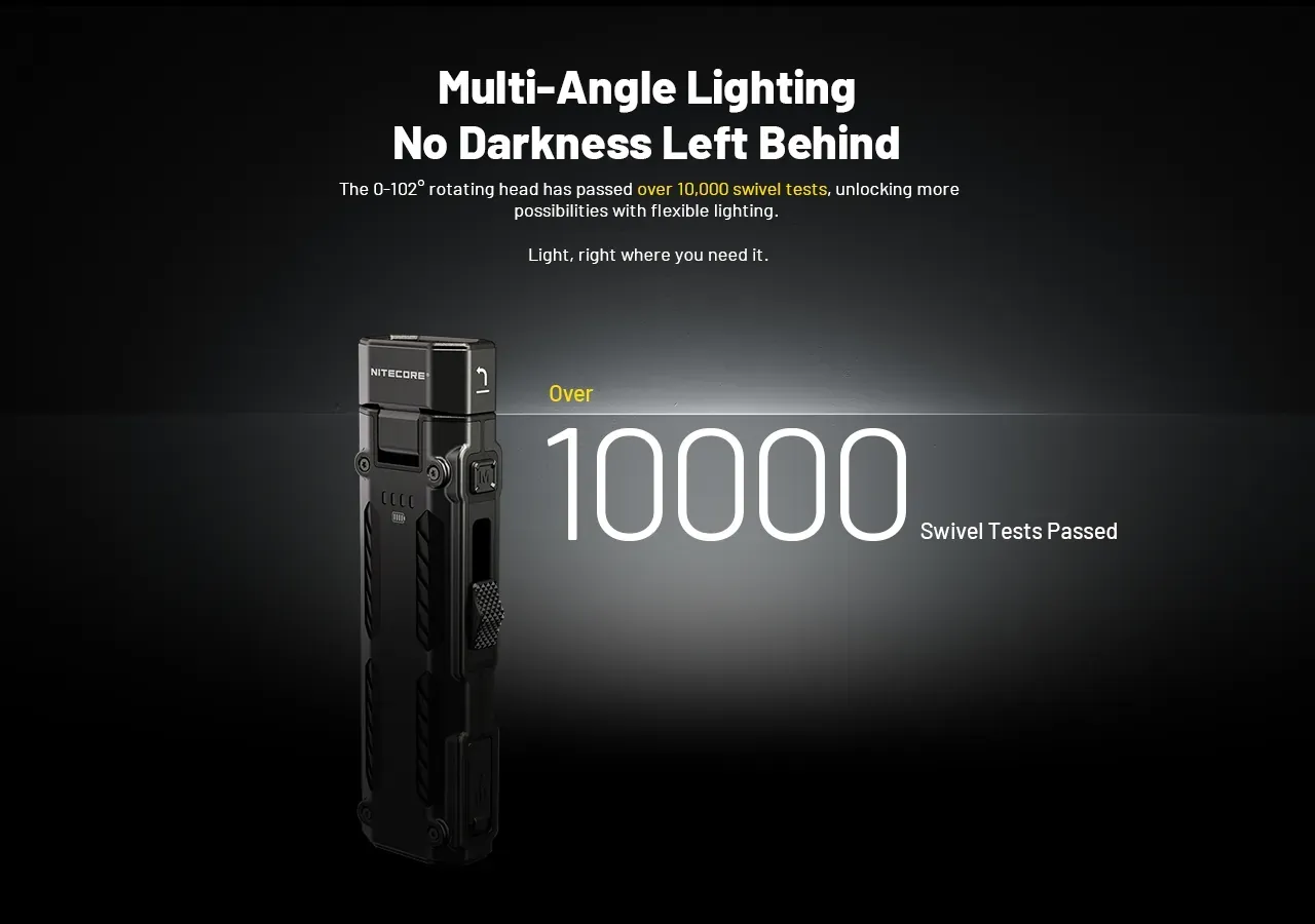 Featuring a 102° rotating head, paired with a magnetic tail and two-way clip, the flashlight provides flexible hands-free lighting and unlocks more possibilities. It delivers up to 1,600 lumens with a long throw of 153 meters, leaving no darkness behind.
