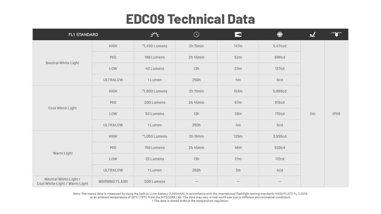 Furthermore, its slide switch and M button enable intuitive operation. With a built-in 1,100mAh Li-ion battery and a USB-C port, the EDC09 supports simultaneous charging and use. Each color temperature is designed with 4 brightness levels and a warning flash mode. When paired with the included diffuser, it turns into a camping ambient light. The compact and flat design with an IPX6 waterproof rating and 2-meter impact resistance, makes the EDC09 an all-rounder for daily, outdoor and industrial applications.