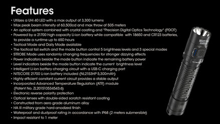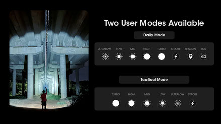 An OLED display provides real-time information on brightness level, battery voltage, remaining power, and more. In addition, the flashlight includes two lock modes, level preset function, and a sensor protection function. It is waterproof according to IP54 standards and can withstand drops from a height of 1 meter, ensuring reliability in various environments.