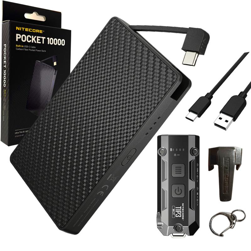 Nitecore TIP3 Black - Multi Color Temperature Rechargeable Keychain Flashlight -720 Lumen w/ Pocket 10000 10,000mAh PowerCharger and Eco-Sensa USB-C Charging Cord