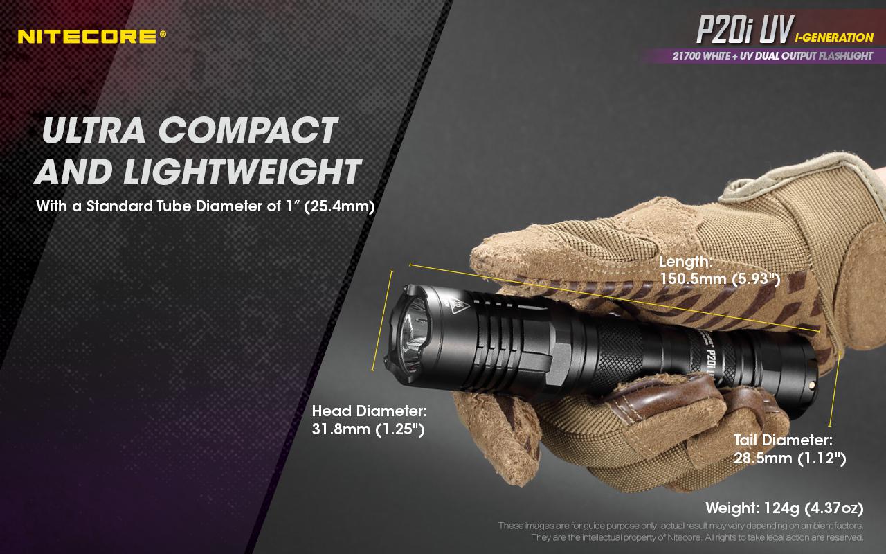 The P20i UV is ultra compact and lightweight with a standard tube diameter of 1” (25.4mm) and compatible with NITECORE gun mounts including GM02MH, GM03, GM04 and more. Specially designed for law enforcement, the included compact NTH20 Tactical Holster enables a quick draw of the flashlight with an adjustable stopper on the clip to suit belts of various sizes and compatible with the MOLLE System. It can be used combined with NTR10 Tactical Ring Pro, which can keep a two-handed grip of the firearm while carrying or operating a flashlight, easy for continuous and stable shooting and reloading. Other optional accessories include the TSL10i signal light and F21i fast charging power system. It is all-weather applicable, IP68 rated, 2m submersible and waterproof, and 2m impact resistant.