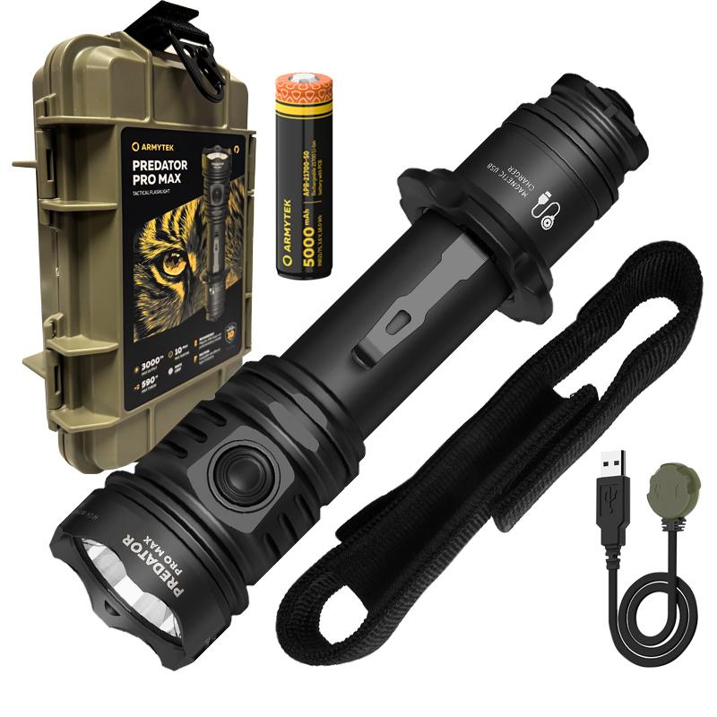 Armytek Predator Pro Max Rechargeable Tactical Flashlight -3000 Lumens White Light w/ Magnetic USB charger, Holster and Battery included