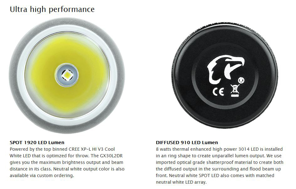 Here comes the groundbreaking LEO / professional flashlight that offers spot and diffused output in one LED flashlight. GX30L2DR offers new LED and driver for the highest output and beam distance in its class. It also features upgraded high capacity li-ion battery pack and new fast charging system. The all-new innovative two buttons control that allows user to conveniently opreate the light with one-hand only.