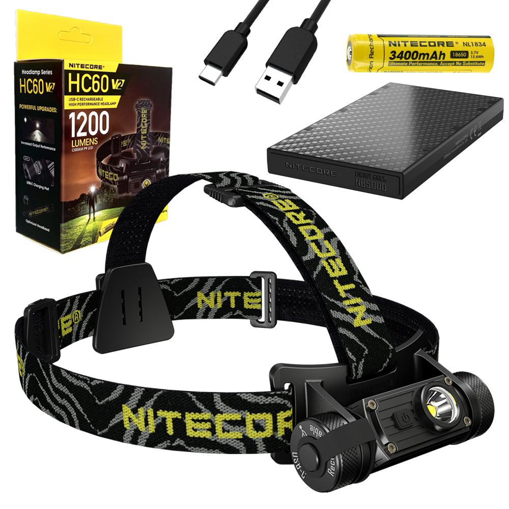 COMBO: Nitecore HC60 V2 High Performance Rechargeable USB-C Headlamp- 1200 Lumens w/ NB5000 5,000mAh Powerbank, NL189 3400mAh Battery Included and Free Eco-Sensa Type C USB Cable