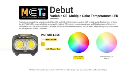 MCT (Variable CRI Multiple Color Temperatures) Lighting System. Featuring a symmetrical arrangement of high-CRI and high-efficiency cores, paired with a multi-faceted optical lens system, the MCT UHE LEDs create a lighting system with multiple CRI options, color temperatures, and high luminous efficiency. It faithfully renders the true-to-life colors and fine details of outdoor environments, and provides adaptable lighting for complex and changeable outdoor conditions.